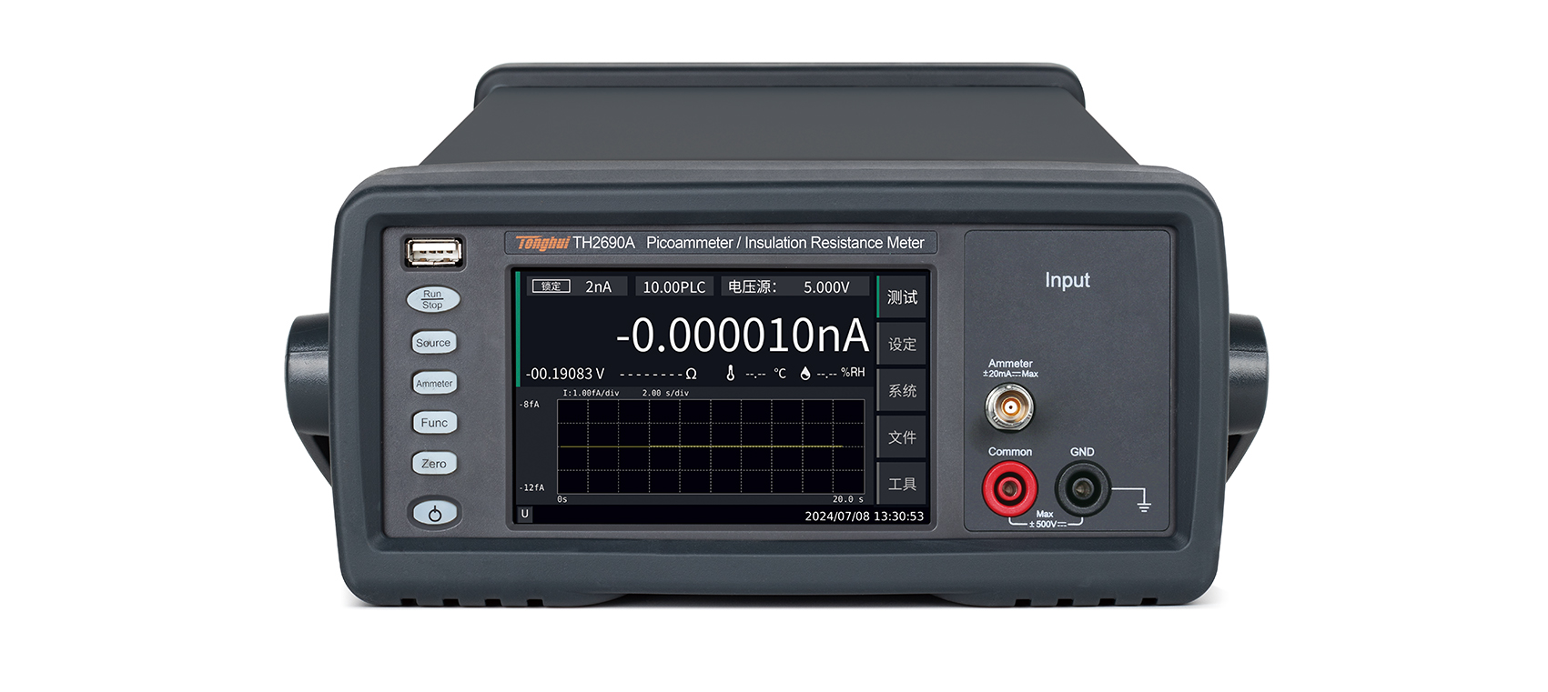 与传统的皮安表和高阻计不同,TH2690系列采用5吋彩色LCD电容触摸屏,使操作更直观便捷。 TH2690系列还提供多种视图模式以便用户观察数据。除数字格式外,测量数据还可以转换为直方图及趋势图的形式,使用户能即时查看测量数据的分布规律或变化趋势。