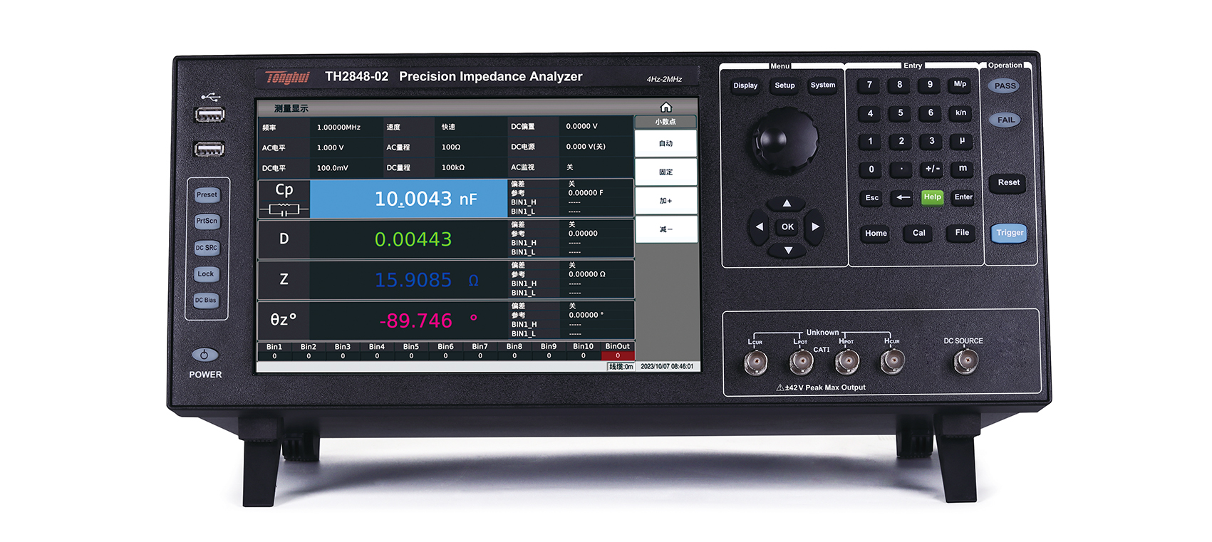 TH2848系列精密阻抗分析仪设计频率从4Hz-2MHz/5MHz/10MHz,标配了压电导纳圆、介电常数测试功能,让阻抗分析功能得以进一步提升。