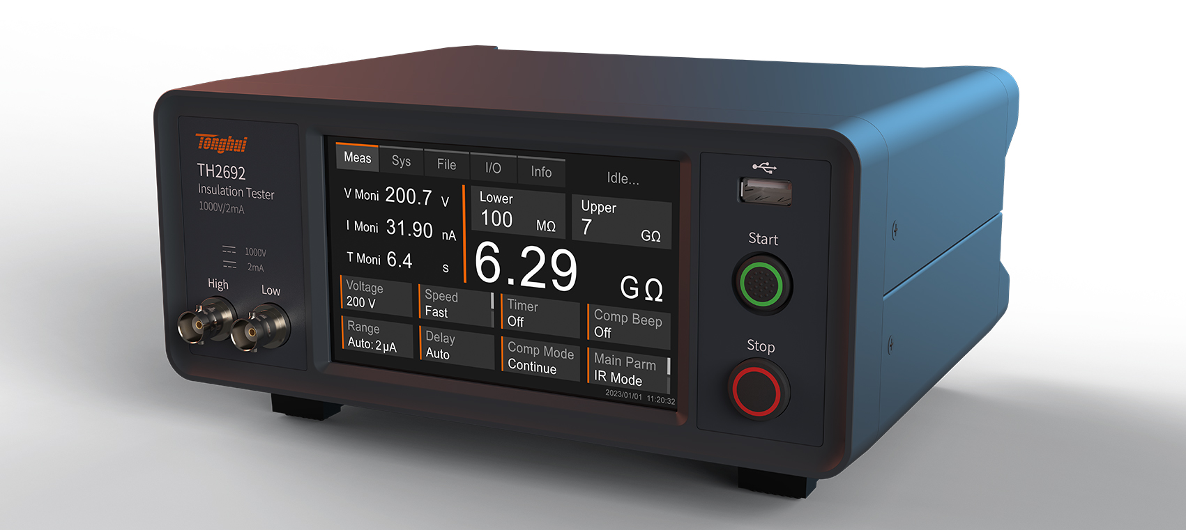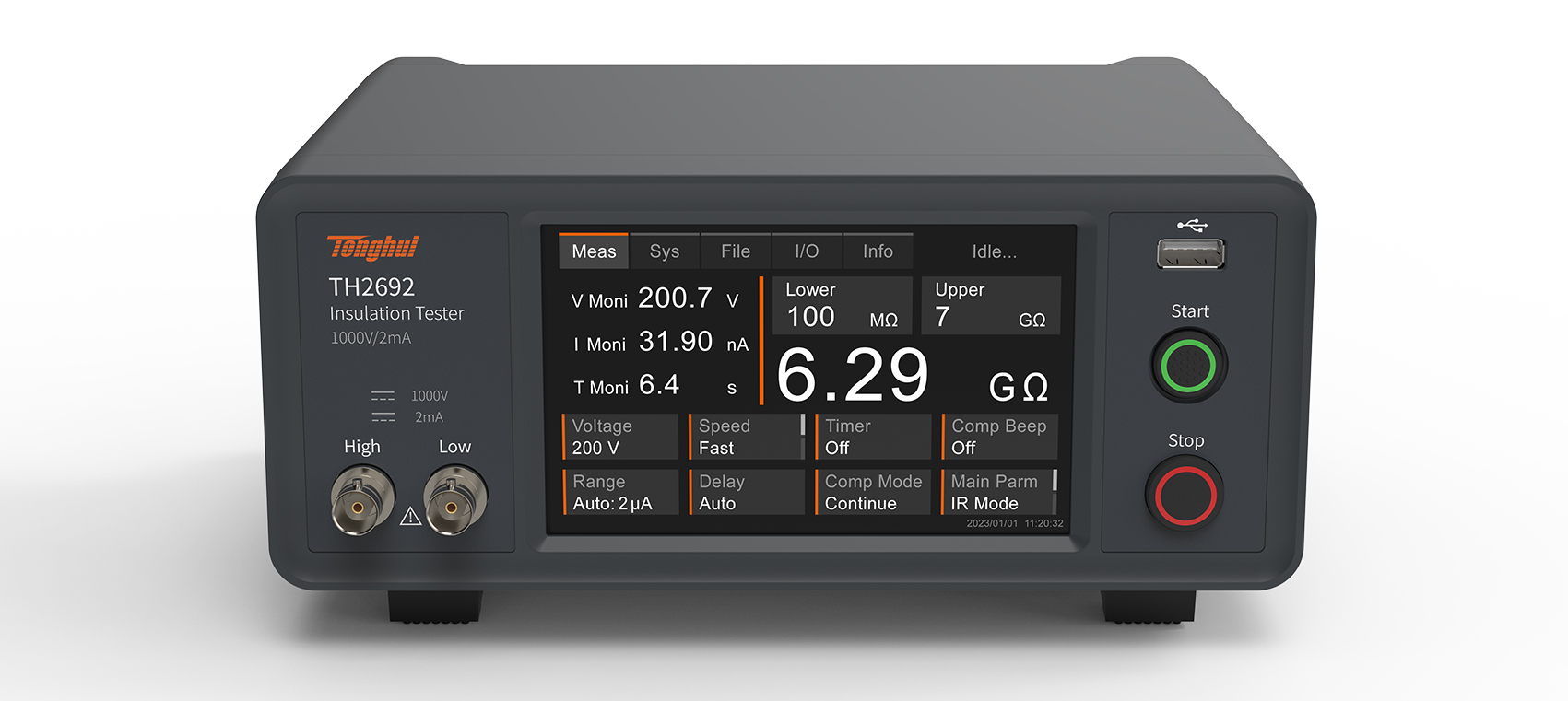 仪器可对电流或绝缘电阻进行比较分选,主参数为绝缘电阻模式时上下限设置范围:0.000 - 1000GΩ,主参数为电流模式,上下限设置范围:0.000 - 1000A,主副参数可直接点击屏幕主参数位置快速切换。