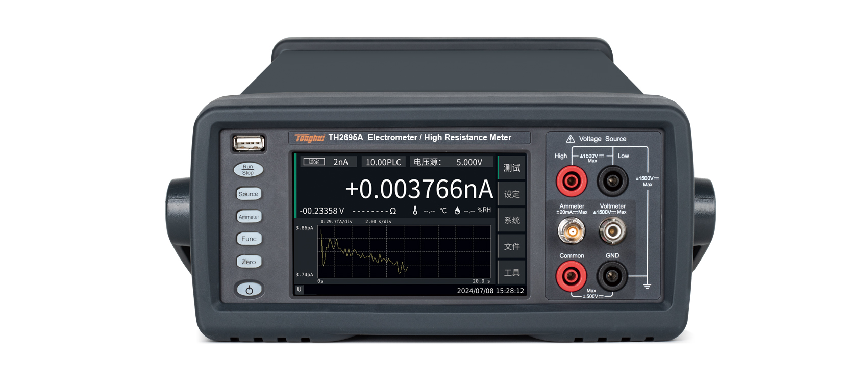 TH2690系列涵盖飞安表/皮安表/静电计/高阻计,构建了一个全面的多需求测量能力矩阵,该矩阵树立了测量功能的标杆。具体而言,飞安表/静电计部分,凭借0.01fA(10-17A)最小电流分辨率,可满足大部分场景的微弱电流测量需求。高阻计支持测量高达3/1.5EΩ(1018Ω)的电阻,并且内置电压源分为3000V/1500V