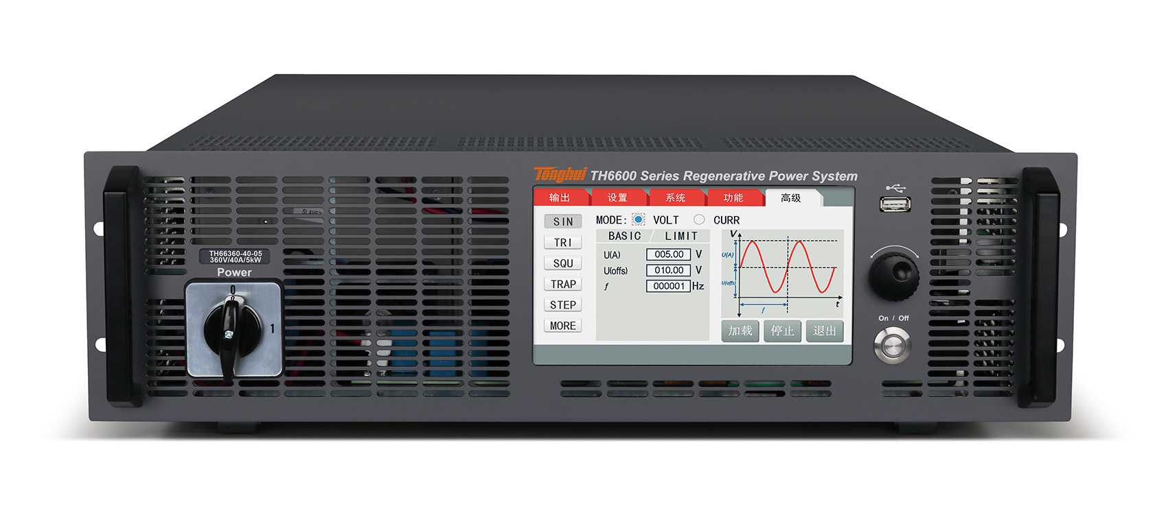 TH6600系列支持主从模式并机,功率最大可扩展至480kW,主动均流功能可保证每台仪器均未工作在最大功率状态;内置函数发生器,内置多种波形模板及编辑任意波形,并可以通过USB接口导入LIST生成波形。