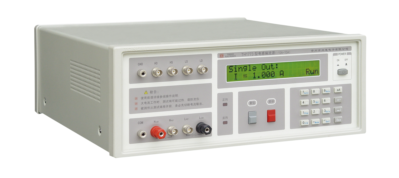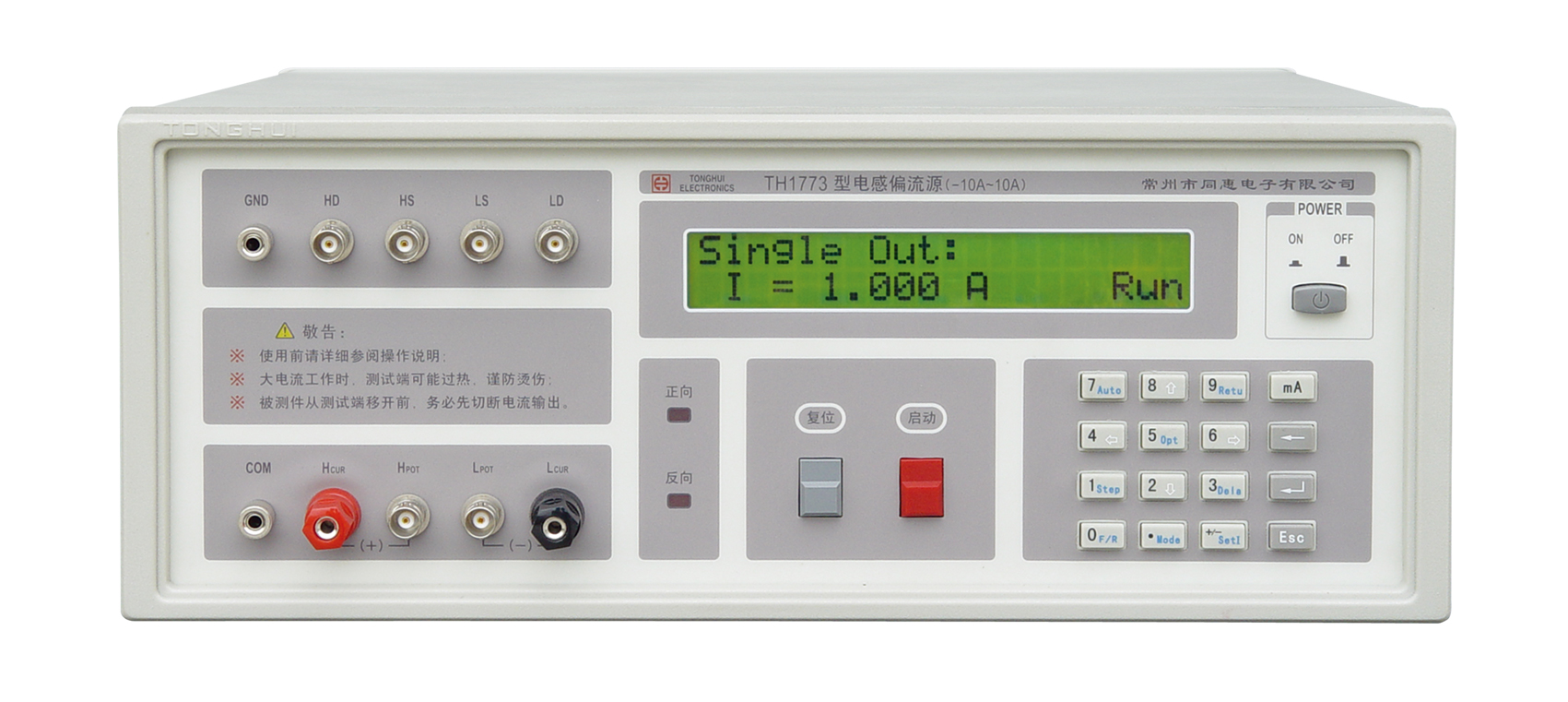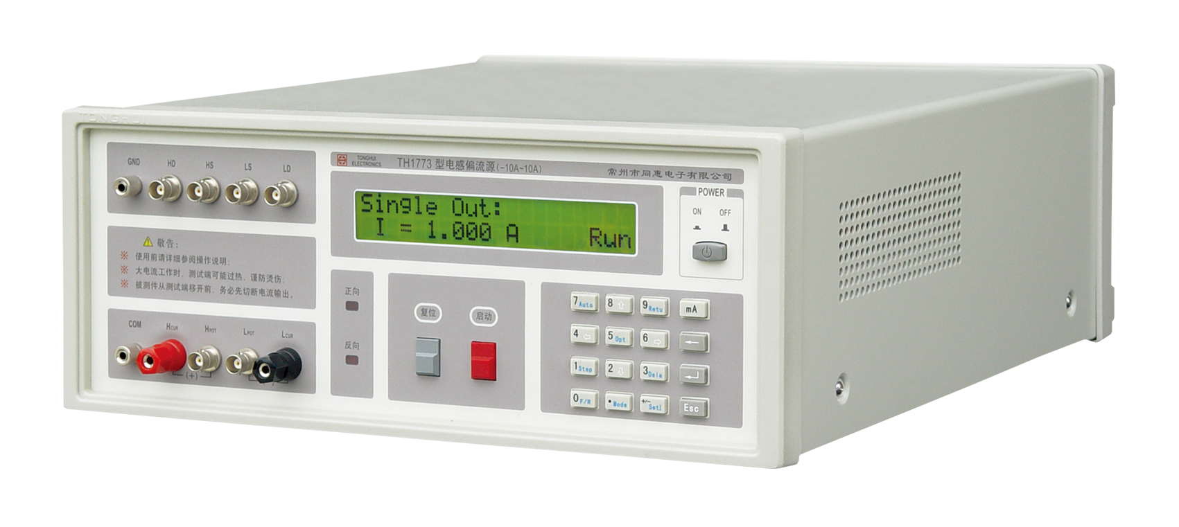 TH1773型直流偏置电流源(也称直流磁化电源)主要用于电感,变压器线圈进行电感测量时施加直流偏置电流,对该类仪器除需达到所需电流外,还需有对电感量测量影响小,频率响应宽(叠加直流电流时可使用高频LCR表进行测量)等要求。该产品通过微处理器控制,采用自动电流平衡原理进行交直流叠加及电流的稳定,可正向或反向输出0-10A(TH1773)范围的恒定电流,该产品产生的附加误差小,频响得到大幅提升,大大拓宽了磁芯电感器的偏流测试中的应用范围。直接受控于TH2816A/TH2817A/TH2818/TH2819及多点电流扫描输出功能为方便地进行磁性材料分析提供了良好的解决方案。