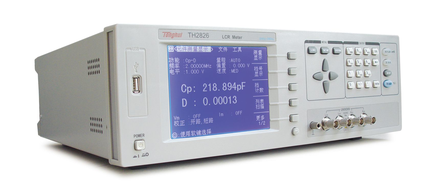 TH2826 系列元件测试仪是符合 LXI 标准的新一代阻抗测试仪器,其 0.1% 的基本精度、 20Hz ~ 5MHz 的频率范围可以满足元件与材料的测量要求,可测量低 ESR 电容器和高 Q 电感器的测量。可用于诸如传声器、谐振器、电感器、陶瓷电容器、液晶显示器、变容二极管、变压器等进行诸多电气性能的分析。