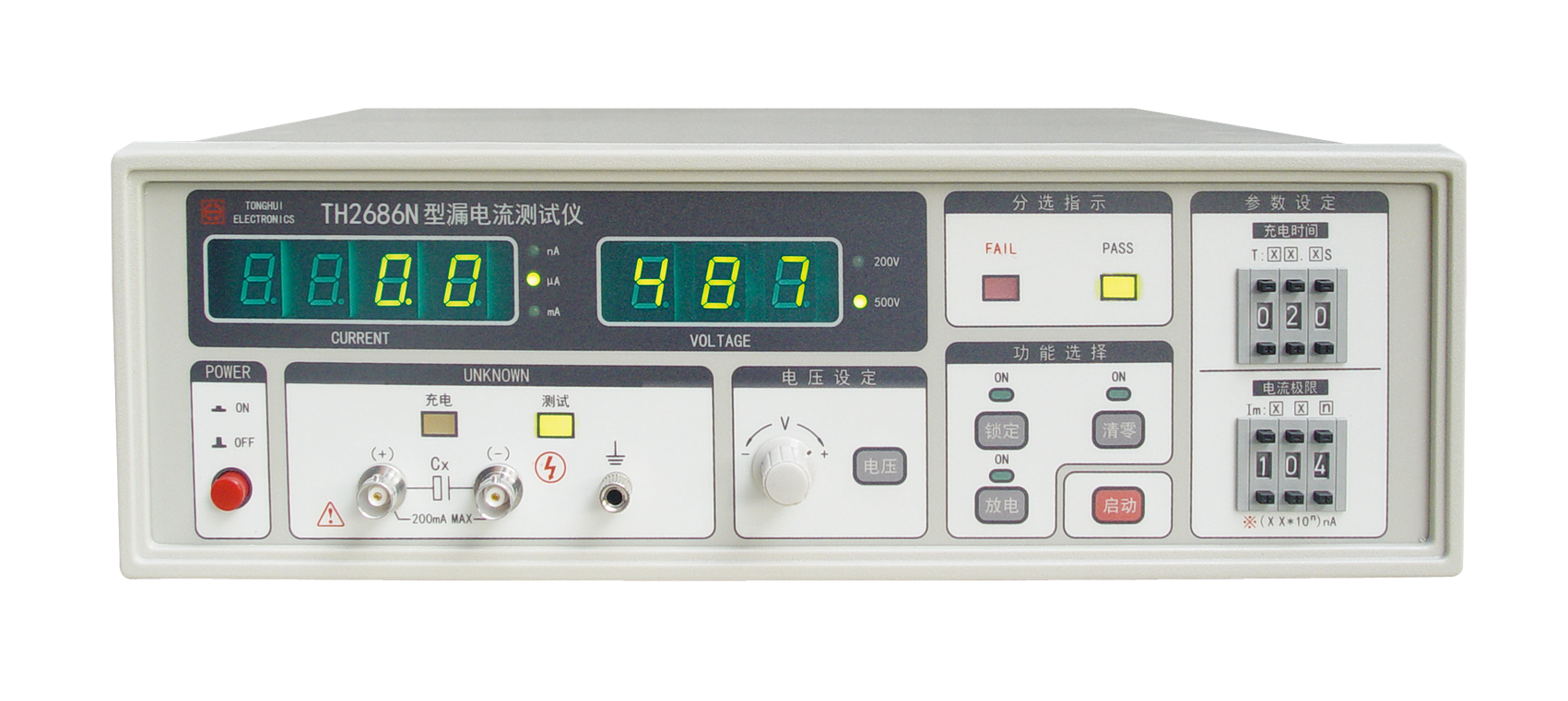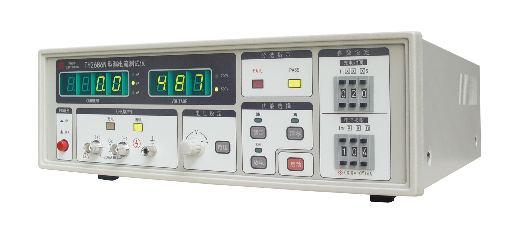 TH2686型电解电容漏电流测试仪是一种以微处理技术为基础的自动测量电解电容漏电流参数的测试仪器。测试电压连续可调,电压三位数字显示,电流三位半数字显示,充电-测试自动转换,最大测试电压500V,最大测试电流20mA,最大充电电流200mA,最长自动充电时间为99.9秒。仪器具有电流超限指示,测试速度快,操作方便,安全可靠等特点。适用于电解电容器生产线质量保证、进货检验等要求。
