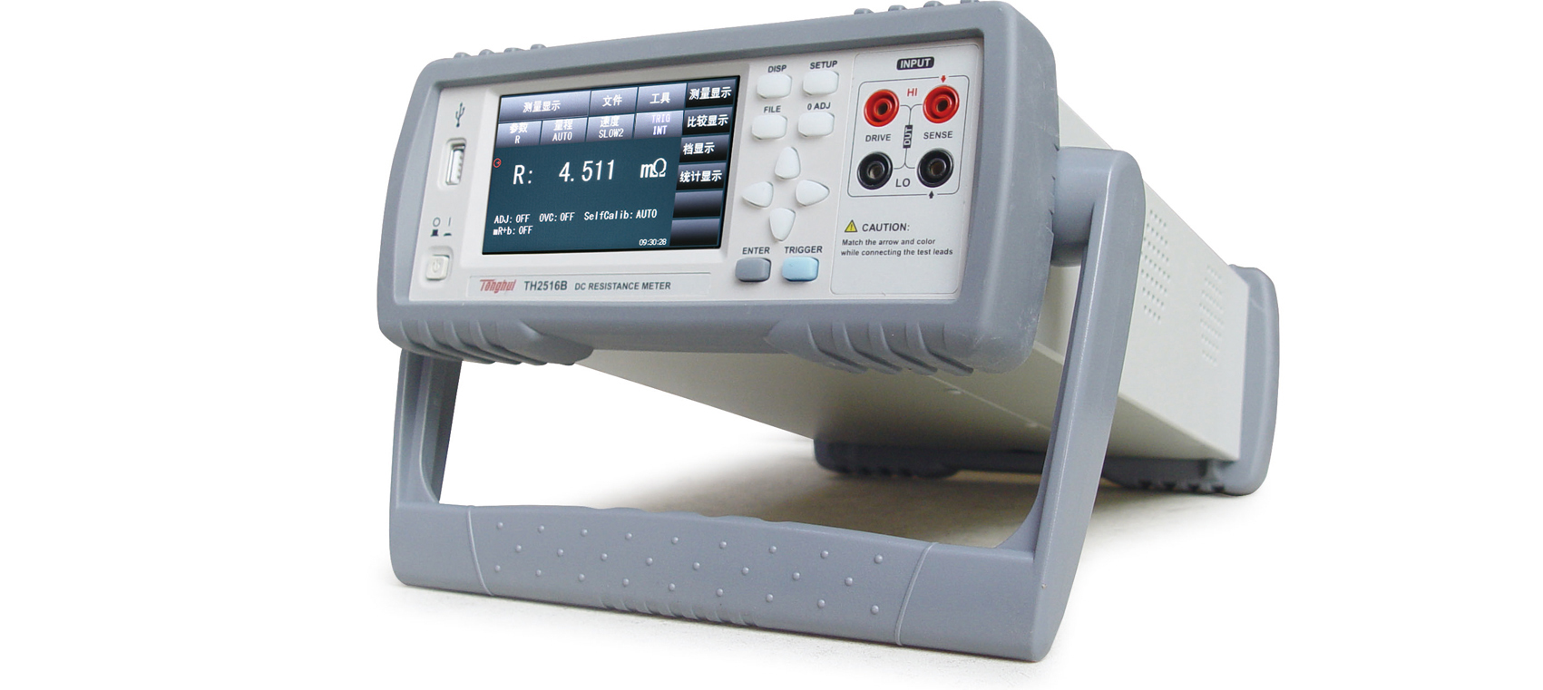 TH2516直流电阻测试仪采用当前主流的32bits CPU和高密度SMD贴装工艺,带触摸功能的24位色4.3英寸彩色液晶屏,界面清爽、操作便捷;0.05%的最高电阻测量精度及1uΩ最小电阻分辨率,其适用于继电器接触电阻、接插件接插电阻、导线电阻、印制板线路及焊孔电阻等;其超高速的测试速度以及通过handler接口可以输出3档不同边界的比较结果信号,便于生产线上的自动化操作。