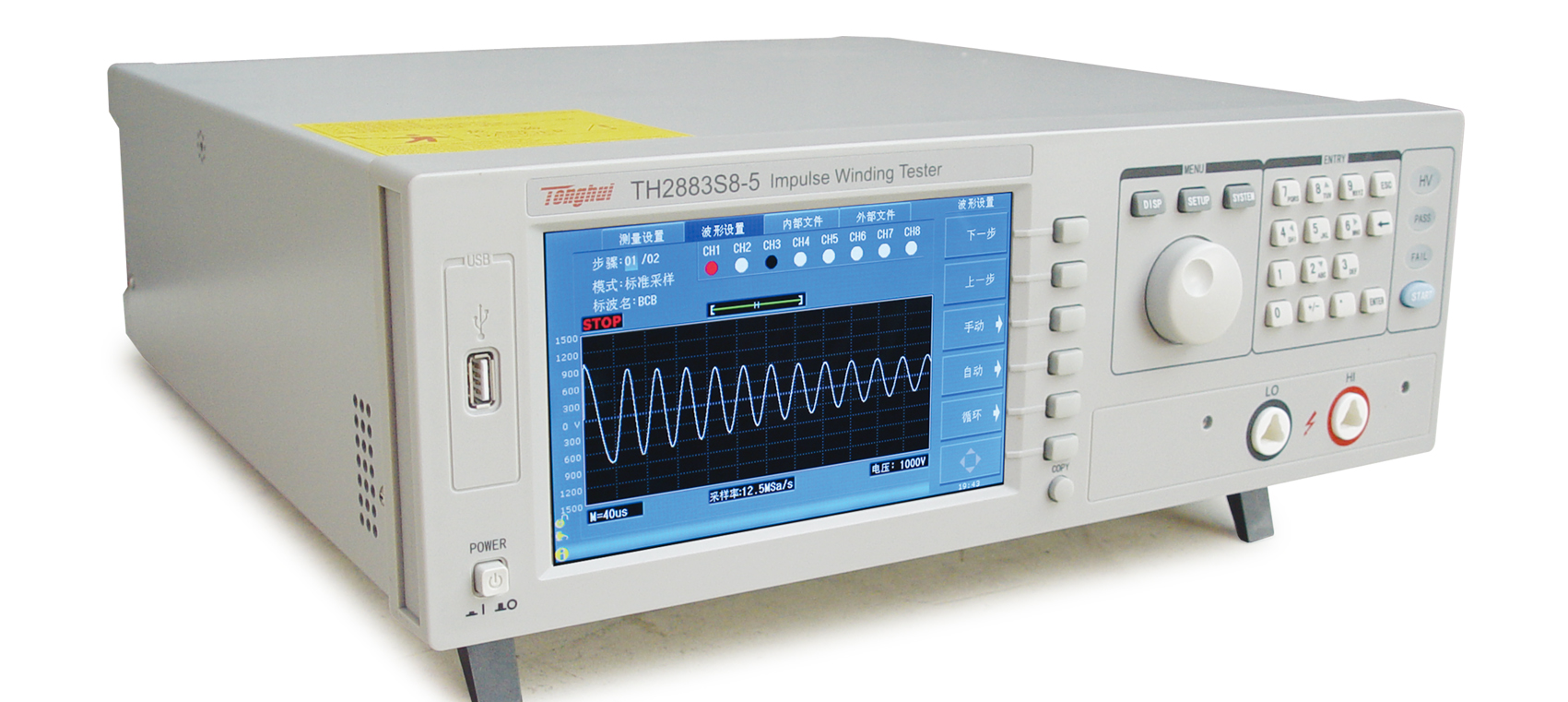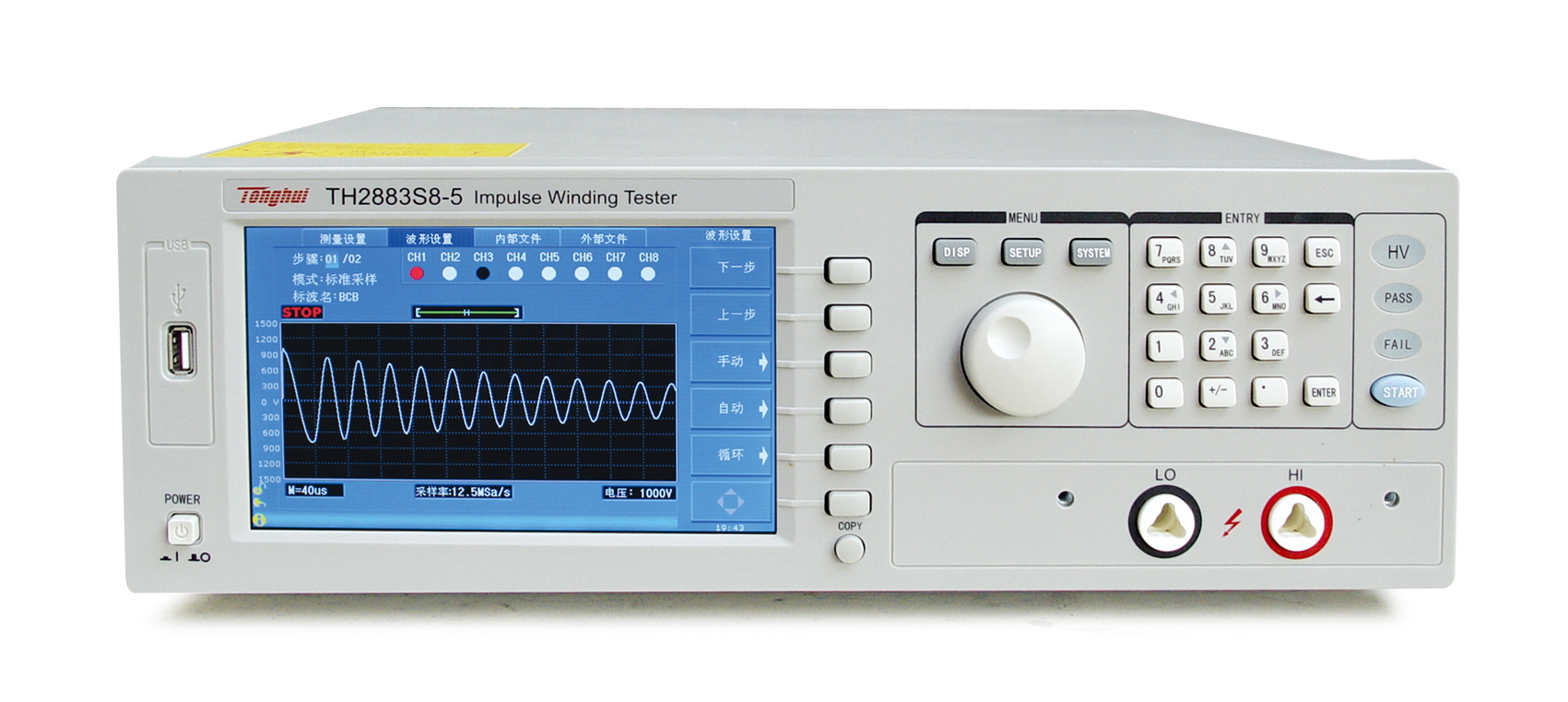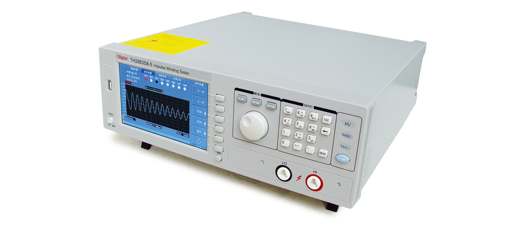 线圈类产品(如变压器、电机等)由于绕线材料、磁性材料、骨架、加工工艺等因素的影响会产生线圈层间、匝间及引脚间等绝缘性能的降低。TH2883系列脉冲式线圈测试仪通过比较被测线圈的衰减振荡波型与标准波形来判定该绕组的电感、品质因素(Q值)、绕组的圈数差、匝间层间短路,在有导磁材料的情况下还能判断其材质的差别,高压脉冲下电晕放电的发生还可以对绕组层间或多个绕组间绝缘不良进行判定。