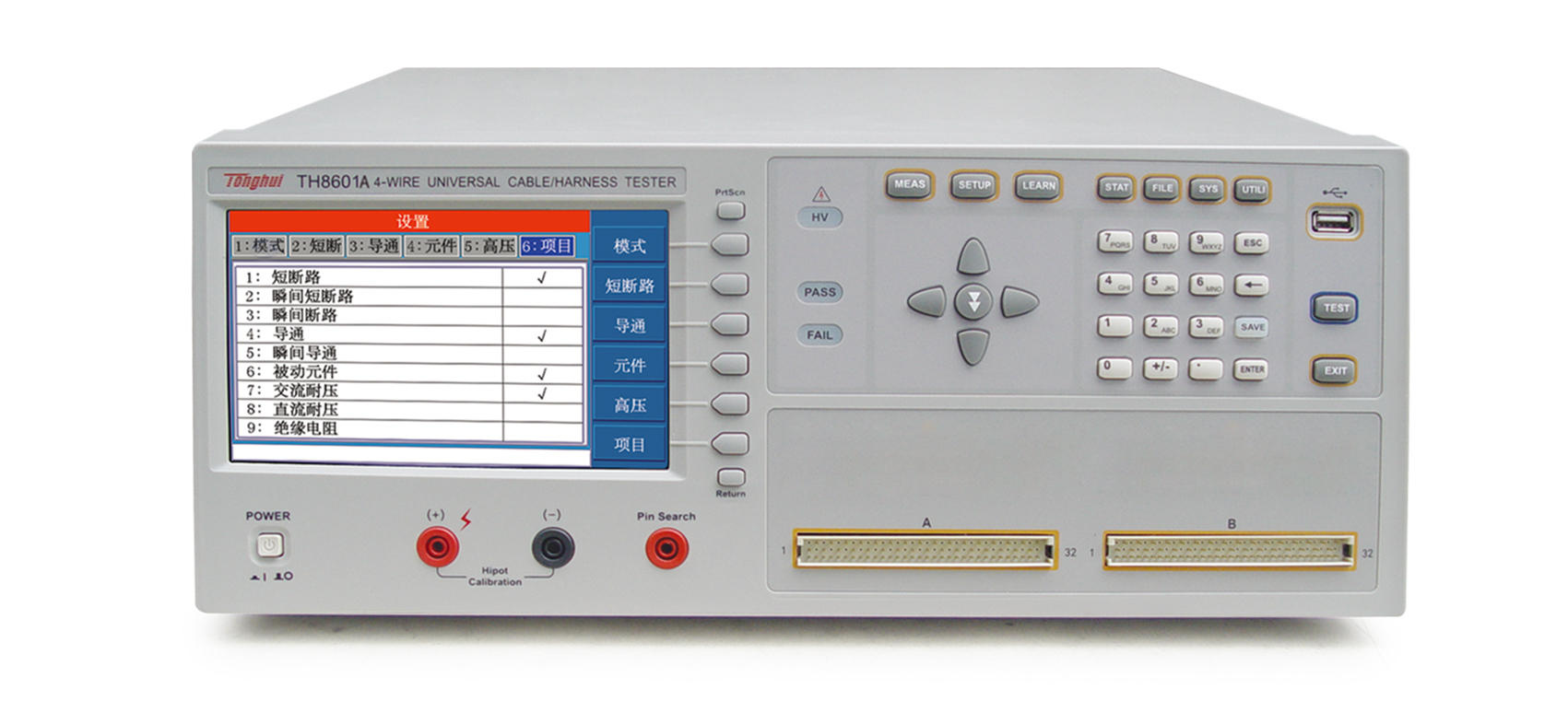 ■ TH8601系列四端线材综合测试仪是专用于各种线缆,线束和排 线品质及连接可靠性检验的多功能,自动化的线材综合参数测试 系统。该系统提供可编程的恒流恒压源以及高压源,测试项目涵盖了导通,被动元件(电感,电阻,电容,二极管),交直流耐压,绝缘电阻各种高低压参数。本系统采用先进的LCR数字采样及高速长寿命通道切换技术,大大提高了测试精度,速度以及使用寿命。采用高低压分离技术,大大的提高绝缘电阻的测试性能。丰富的接口设计,本仪器还提供RS232, RS485, GPIB, USB, Handler等接口,便于用户运用于自动化检测和自动化产线。