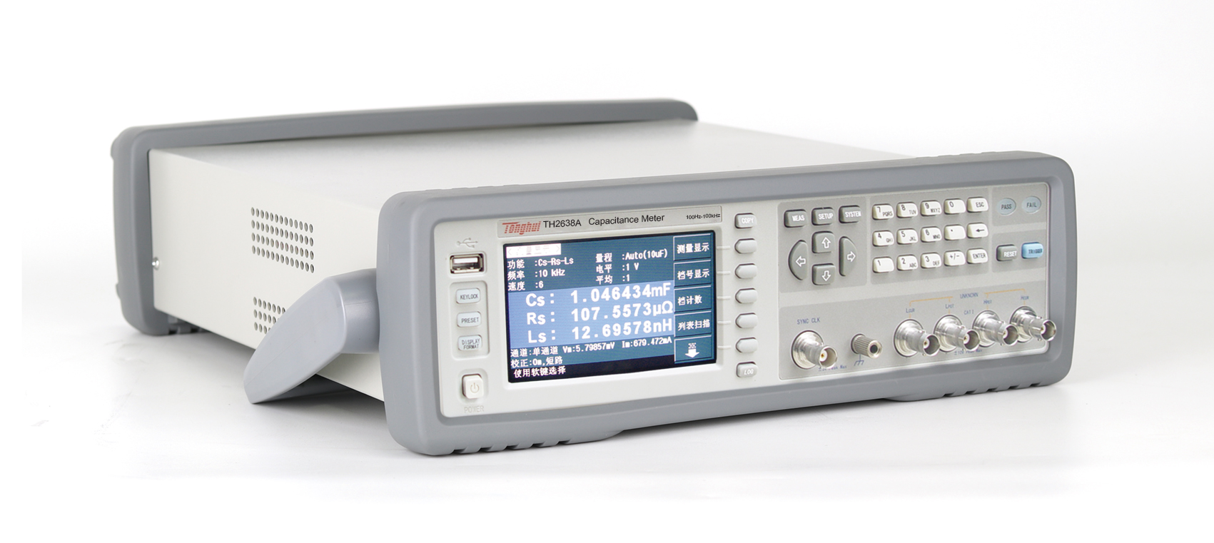 TH2638系列测量电容基本精度为±0.07%,损耗精度高达0.0005,最高速度高达2.3ms;超宽的量程配置,使得TH2638系列能够精确测量从低值到高值的各类电容;超宽的输出阻抗范围和信号电平补偿功能,特别适合于用稳定的测试电平高速高精度测试陶瓷电容器;三参数(Cs-Rs-Ls)测试功能解决了新能源汽车用DC-Link薄膜电容器串联等效电感ESL的测试难题。