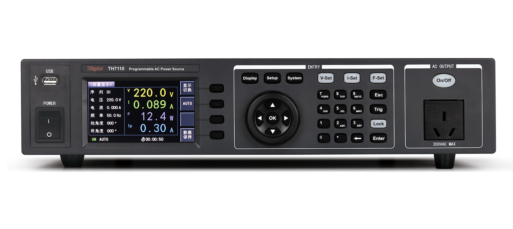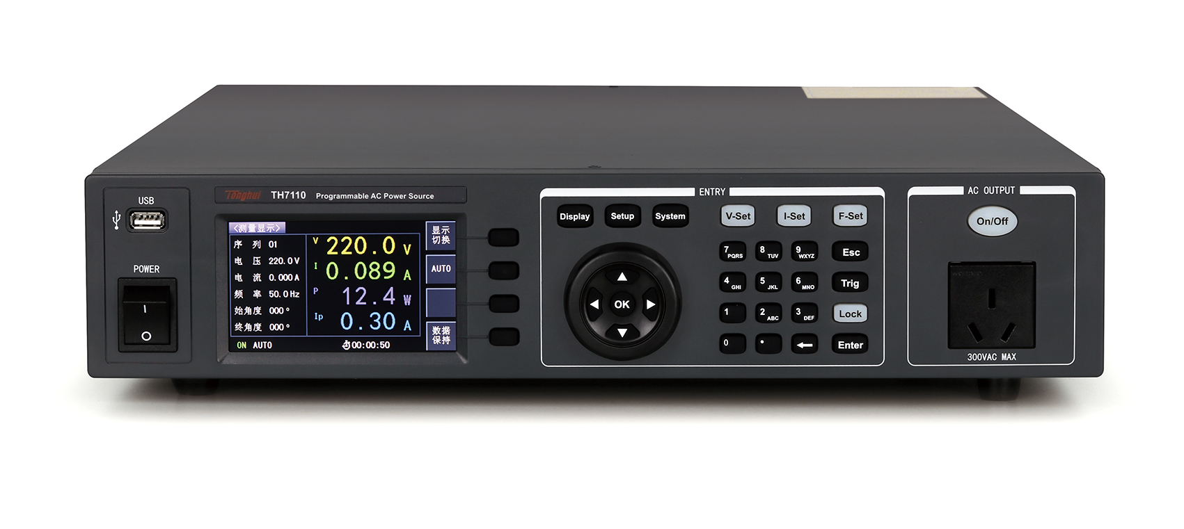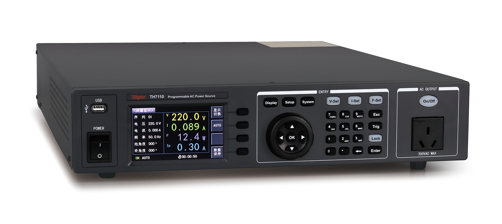 TH7100系列可编程交流电源配备了24位色4.3英寸的液晶显示屏,可同时显示电压(V)、电流(I)、功率(P)、峰值电流(AP)、峰值因素(CF)、功率因数(PF)等测量参数。此外,这款电源还具有超小体积,前后面板输出,安全保护功能完备、操作灵活方便等人性化的设计特点。