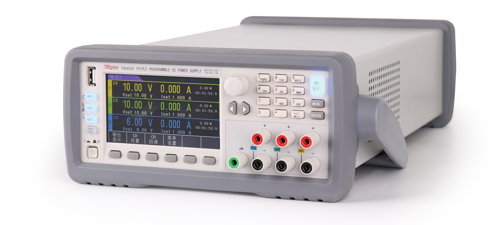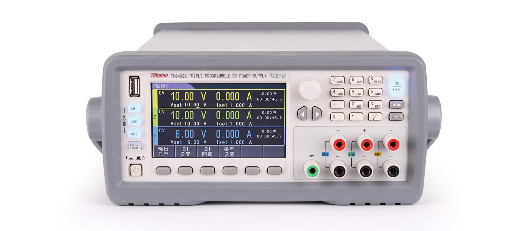 TH6400系列多路输出可编程直流电源涵盖了5个型号(单个通道功率范围5W-180W),其中TH6402B为4通道输出,其余型号为3通道输出。全系列电源具备通道间串、并联以及同步输出功能,并且所有通道的输出参数同屏显示,使用起来更加方便、直观。
