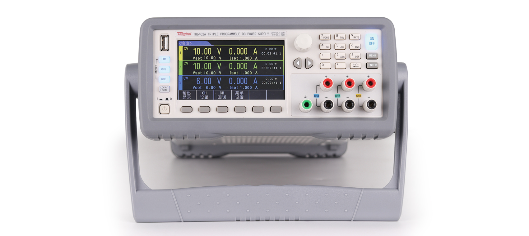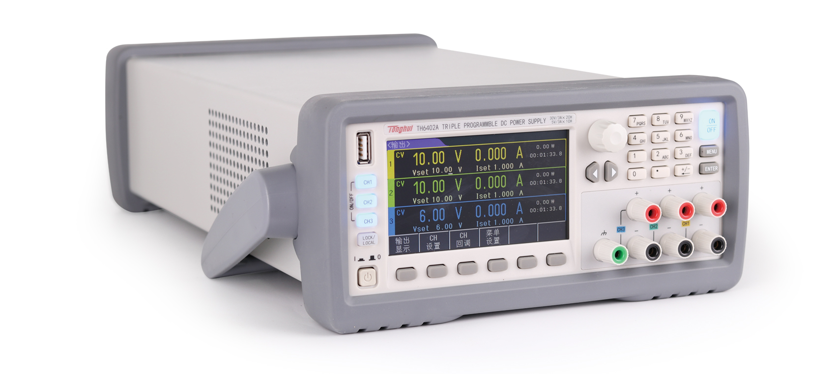 TH6400系列电源均为线性、程控输出设计,因此该系列电源具有纹波小、噪声低、精度高、稳定性强的卓越性能。全系列采用4.3寸TFT LED显示屏,不同通道分屏显示,并以高对比度的颜色加以区分。UI设计方面仪器采用菜单化操作,软键、旋钮控制及输入参数,使用起来方便快捷,能很好的适应产线快速操作以及高校、实验室的应用需求。