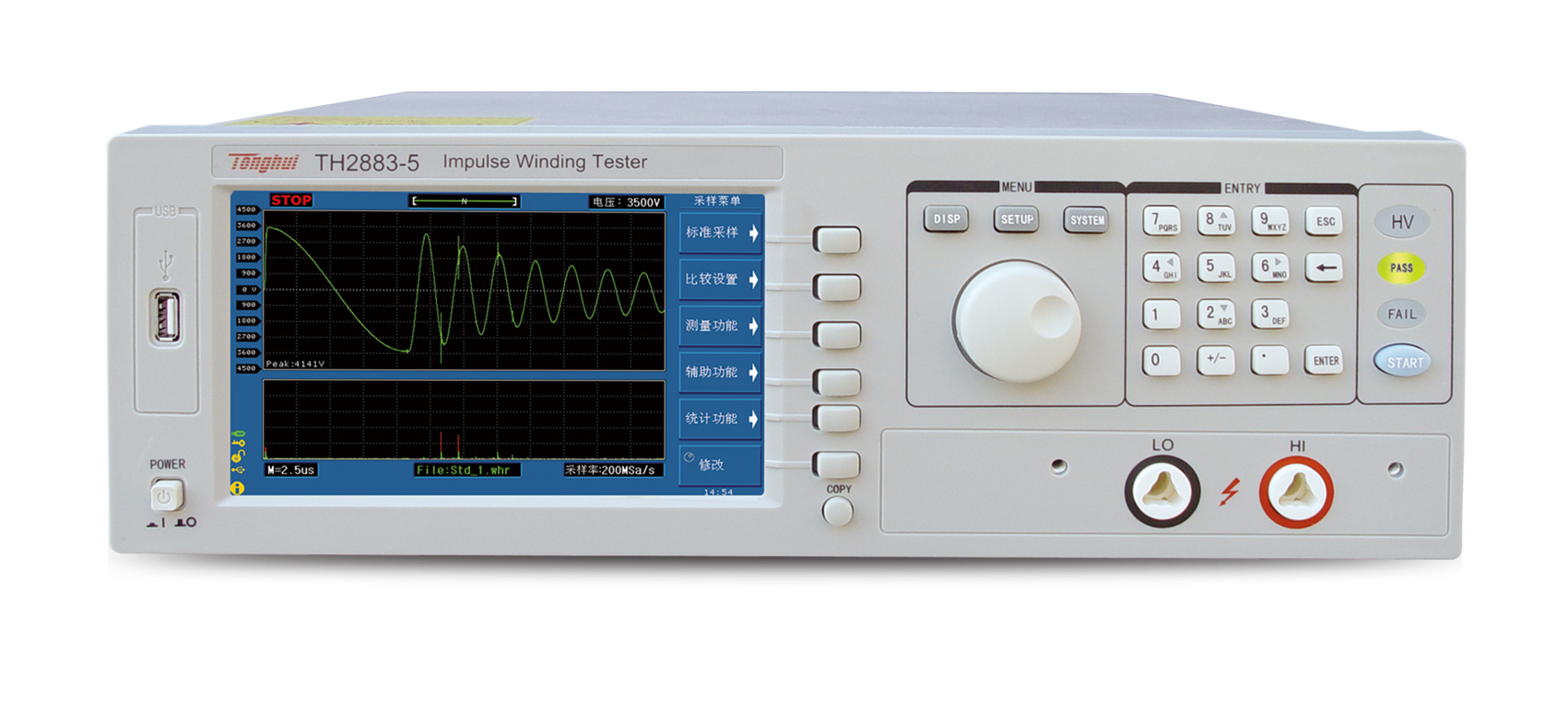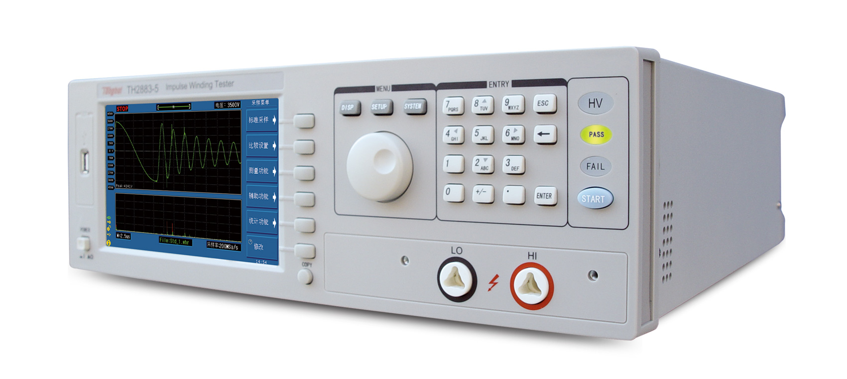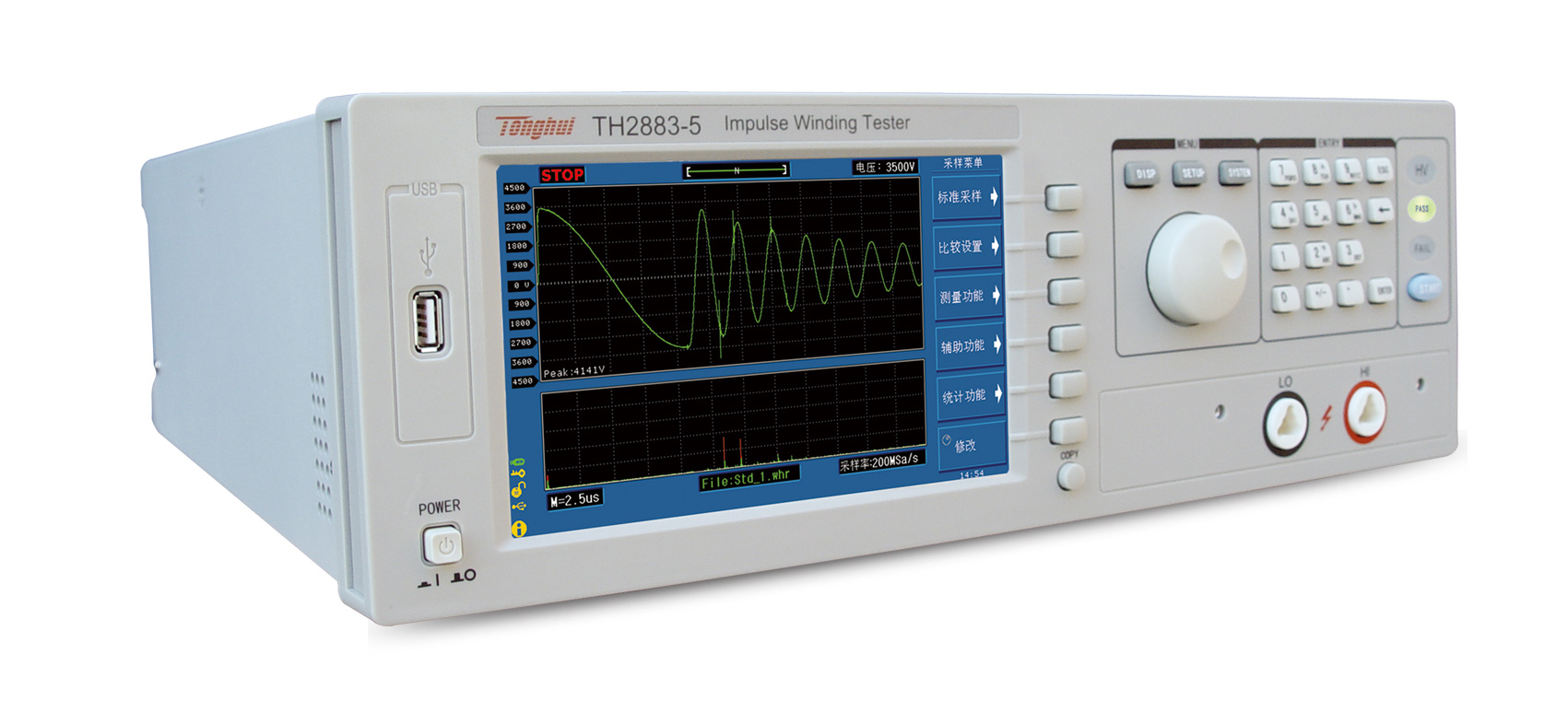 线圈类产品(如变压器、电机等)由于绕线材料、磁性材料、骨架、加工工艺等因素的影响会产生线圈层间、匝间及引脚间等绝缘性能的降低。TH2883系列脉冲式线圈测试仪通过比较被测线圈的衰减振荡波型与标准波形来判定该绕组的电感、品质因素(Q值)、绕组的圈数差、匝间层间短路,在有导磁材料的情况下还能判断其材质的差别,高压脉冲下电晕放电的发生还可以对绕组层间或多个绕组间绝缘不良进行判定。